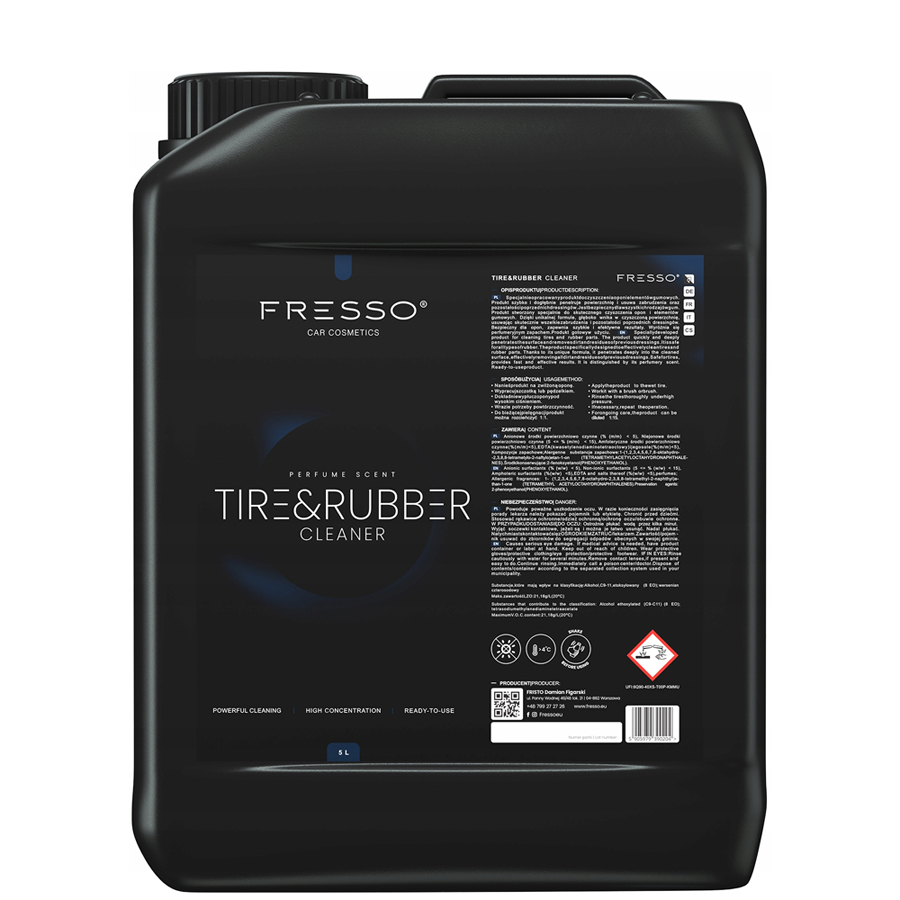 FRESSO Tire & Rubber Cleraner je produkt špeciálne vyvinutý pre efektívne čistenie pneumatík a gumených častí. Vďaka svojmu jedinečnému zloženiu preniká hlboko do čisteného povrchu a účinne odstraňuje všetky nečistoty a zvyšky predchádzajúcich prípravkov. Je maximálne bezpečný pre pneumatiky a zabezpečí rýchle a efektívne výsledky. Zaujme svojou okúzľujucou vôňou. Produkt je okamžite pripravený na použitie.