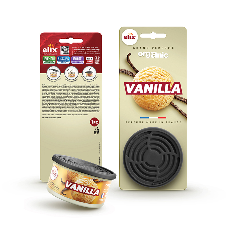 Závesná verzia obľúbeného osviežovača vzduchu ELIX Organic je perfektný pre miesta, kde sa vyžaduje intenzívna a trvácna vôňa. Aróma Vanilla: krémové tóny, ananás, drevo, sladký karamel, vanilka.