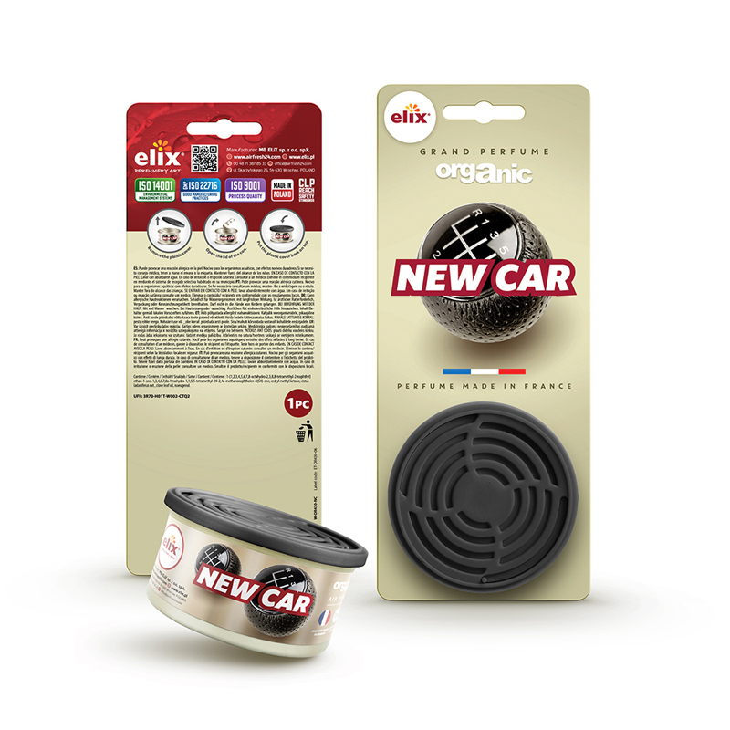 Závesná verzia obľúbeného osviežovača vzduchu ELIX Organic je perfektný pre miesta, kde sa vyžaduje intenzívna a trvácna vôňa. Aróma New Car: mix citrusov, klinček, ruža, fialka, dreviny, pačuli, vanilka, pižmo.